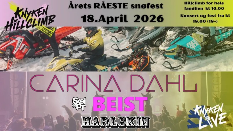 Velkommen til Knyken skisenter lørdag 18. april. Da er det klart for Knyken Hillclimb, familiekonsert med Saba og Beist, og Knyken Live med artistene Carina Dahl, Beist, Harlekin og Skei & PT.